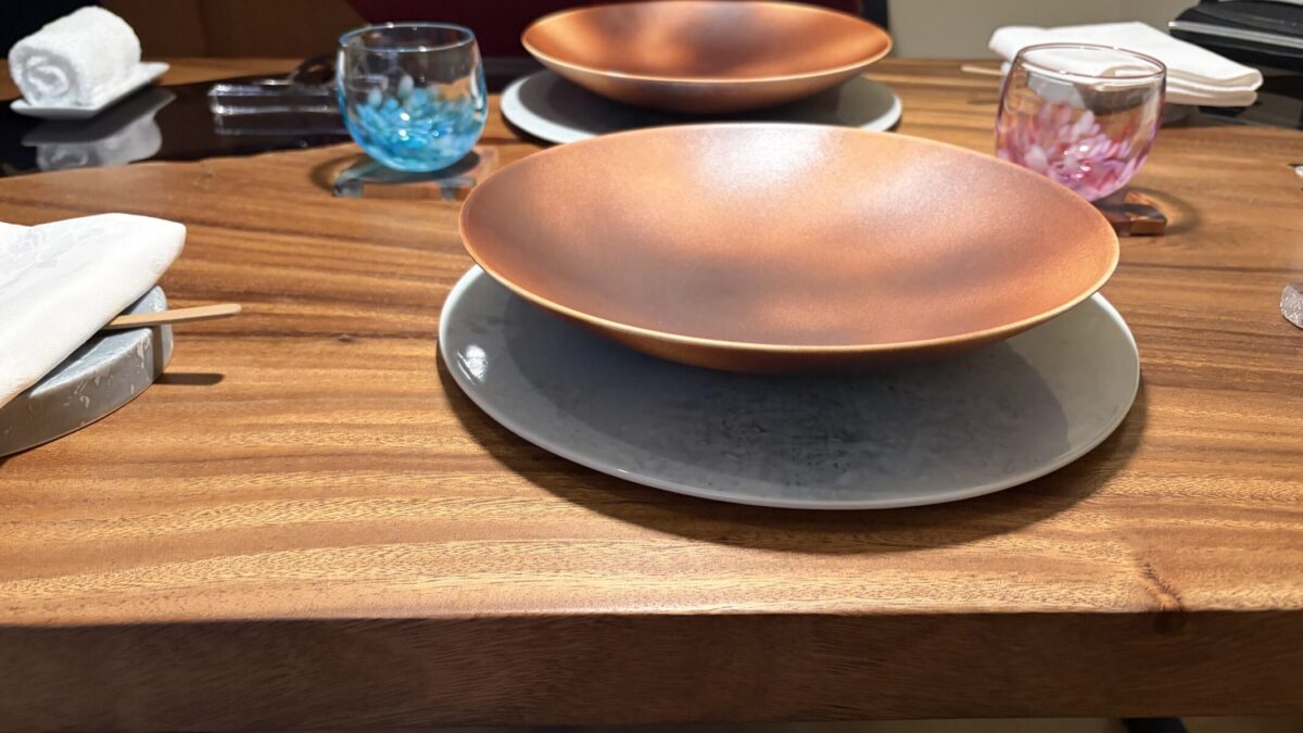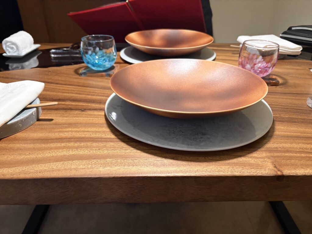 まずはテーブルに着いた瞬間の**「ショープレート(位置皿)」**のお話からスタート。
